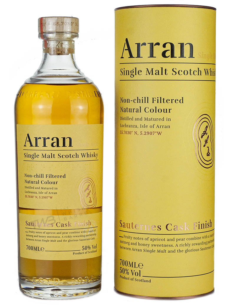 Arran Sauternes Cask Finish is a luxurious Island single malt Scotch whisky that undergoes double maturation. After its initial ageing in oak casks, the whisky is finished in hand-selected Sauternes wine casks from the Bordeaux region of France. The result is a beautifully sweet and complex single malt, combining Arran’s orchard fruit freshness with the honeyed richness of French dessert wine.
