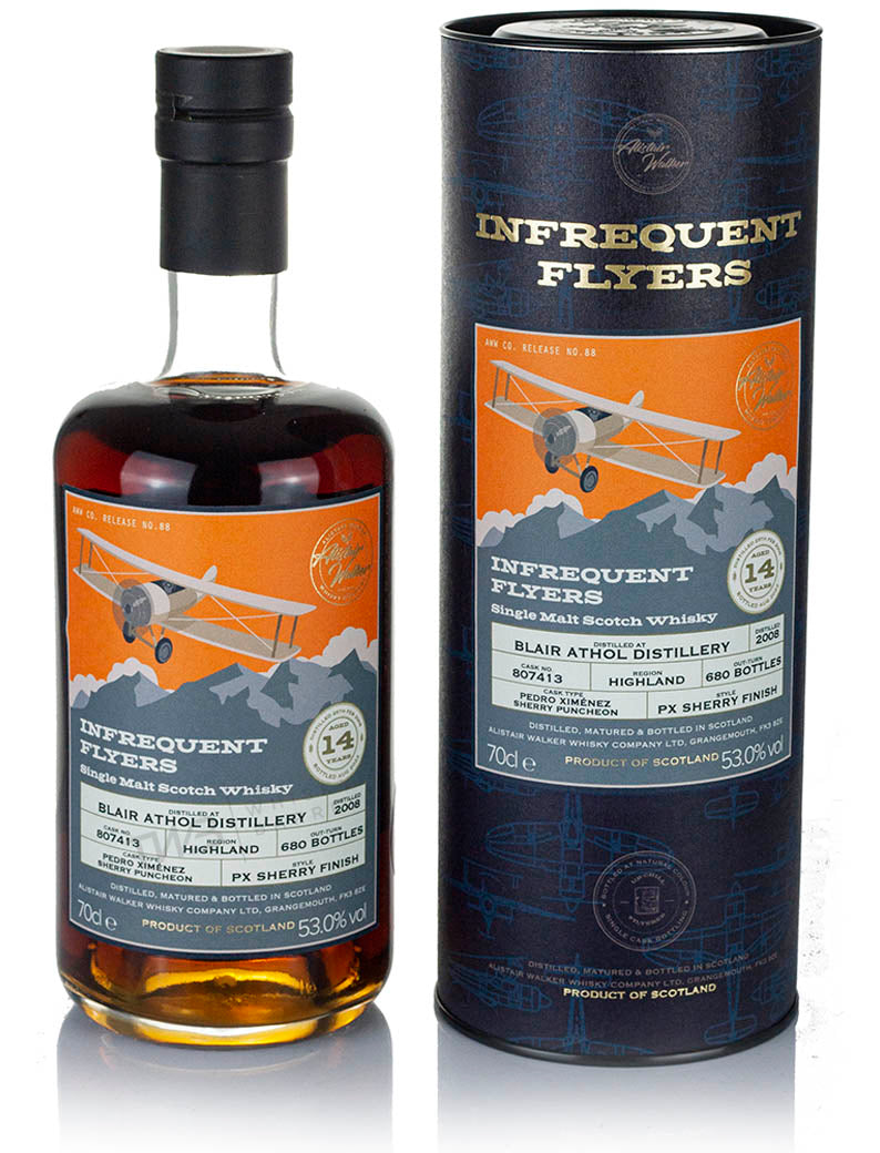 Blair Athol 14 Year Old 2008 vintage Highland single malt Scotch whisky. Single PX Sherry Puncheon #807413 bottled August 2022 by The Alistair Walker Whisky Co. for the Infrequent Flyers series. 680 bottles.