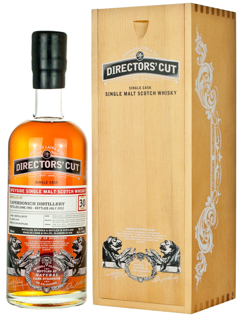 Caperdonich 30 Year Old 1982 vintage Speyside single malt Scotch whisky. Single refill sherry butt #8778 bottled July 2012 by Douglas Laing & Co. for the Director's Cut series.