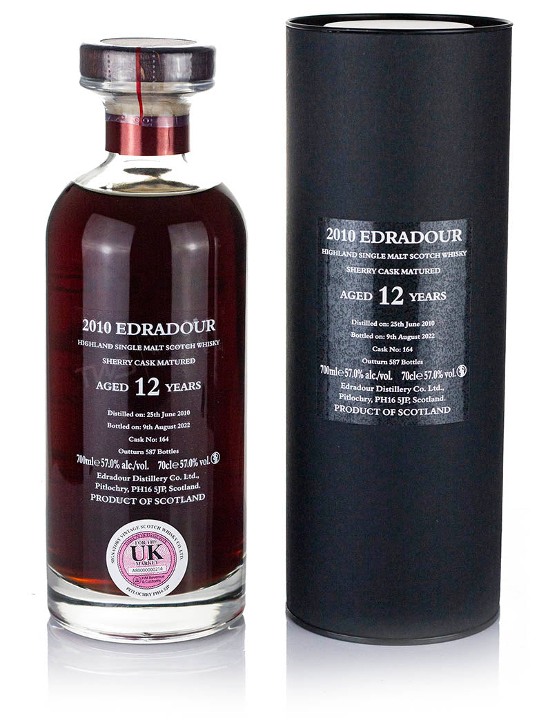 Edradour 12 Year Old 2010 vintage Highland single malt Scotch whisky. Single sherry butt #164 bottled in a Ibisco decanter on 9th August 2022. 587 bottles.