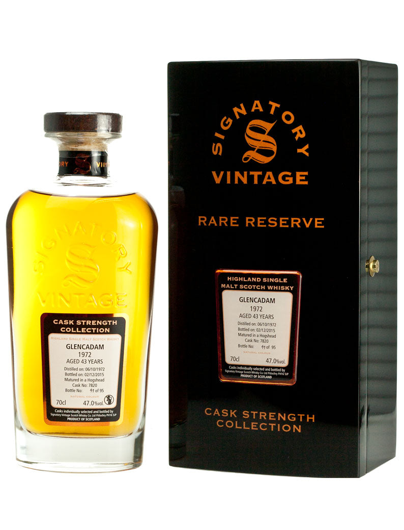 This Glencadam 43 Year Old 1972 is an ultra-aged Highland single malt Scotch whisky, bottled by Signatory Vintage for their prestigious Cask Strength & Rare Reserve Collection. Distilled in 1972 and matured in a single hogshead (#7820) for over four decades, it was bottled at natural cask strength in December 2015, yielding just 95 individually numbered bottles. Presented non-chill filtered and with natural colour, this is a truly rare and refined expression from the historic Brechin-based distillery.