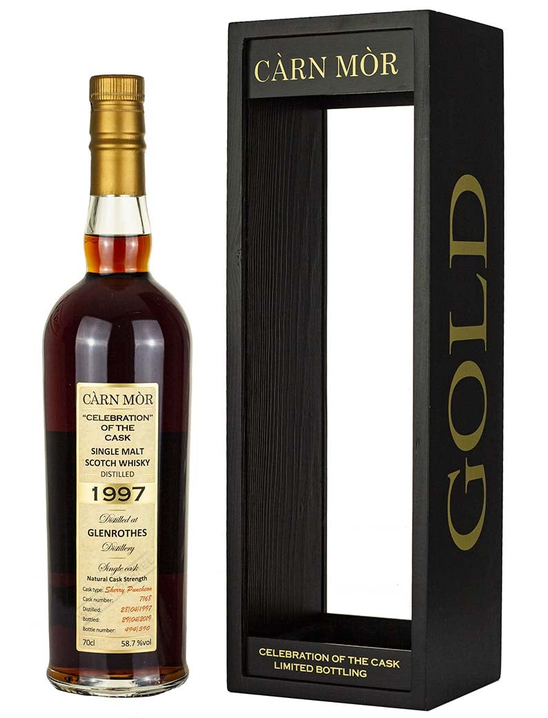 Glenrothes 22 Year Old 1997 vintage Speyside single malt Scotch whisky. Single cask sherry puncheon #7168 bottled April 2019 by Morrison & MacKay for the Carn Mor Celebration of the Cask Black Gold series. 590 numbered bottles. MAXIMUM 1 BOTTLE PER CUSTOMER.