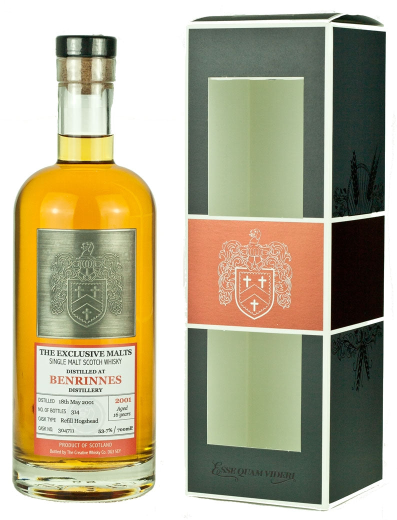 ベンリネス 16年 2001年ヴィンテージ スペイサイド シングルモルト スコッチウイスキー。シングルカスクリフィルホグスヘッド #304711、クリエイティブウイスキー社によってエクスクルーシブモルツシリーズのためにボトリングされました。315本。