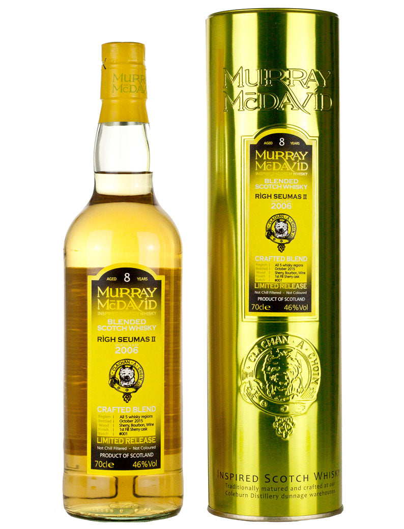 ブレンドスコッチウイスキー Rìgh Seumas II 8年熟成 2006年ビンテージ。ブレンドウイスキーには、ブルイックラディ、アラン、ロスデュー、トバモリーが含まれ、マレー・マクダビッドによってボトリングされています。1,298本。