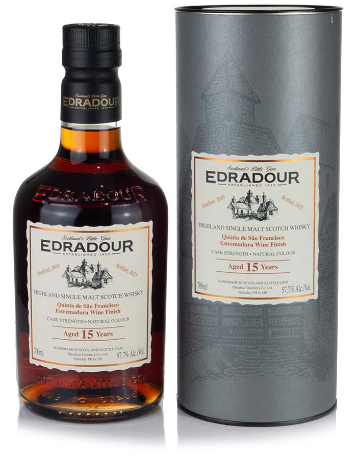 エドラドゥール15年 2010 キンタ・デ・サン・フランシスコ 酒精強化ワインフィニッシュは、2010年に蒸留され、 2025年に瓶詰めされた、豊かな風味を持つハイランド産シングルモルトスコッチウイスキーです。伝統的な熟成を経て、ポルトガル産キンタ・デ・サン・フランシスコ酒精強化ワインホッグスヘッドでフィニッシュされたこの個性的なウイスキーは、果実味とスパイスの複雑な層を醸し出しています。この独自の二重熟成により、エドラドゥール本来のフルボディの個性がさらに際立っています。