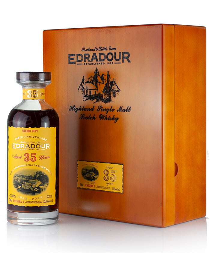 エドラダワー35年 1989エニグマ No.1は、歴史あるエドラダワー蒸留所の200周年を記念して発売された、極上のハイランドシングルモルトスコッチウイスキーです。 1989年9月27日に蒸留され、ファーストフィルのオロロソシェリーバット(#355)で35年間熟成されたこの特別なウイスキーは、 2025年7月2日にナチュラルカスクストレングス(アルコール度数52.6%)で瓶詰めされました。わずか498本しか生産されなかったこのウイスキーは、エドラダワー蒸留所の歴史を彩る希少な逸品です。美しく仕上げられた木製のケースに、クリスタルグラスが2つセットされています。