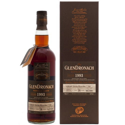 グレンドロナック 18年 1993年ビンテージ ハイランド シングルモルト スコッチウイスキー。シングル オロロソ シェリー バット #1607、2012年6月に蒸留所ビジターセンターのためにボトリングされました。606本の番号付きボトル。