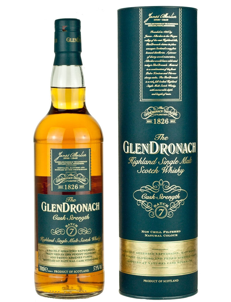 グレンドロナック カスク ストレングス バッチ 7 ハイランド シングル モルト スコッチ ウイスキー。ペドロ・ヒメネスとオロロソ シェリー樽で熟成されたフル ストレングス、2018年ボトリング。