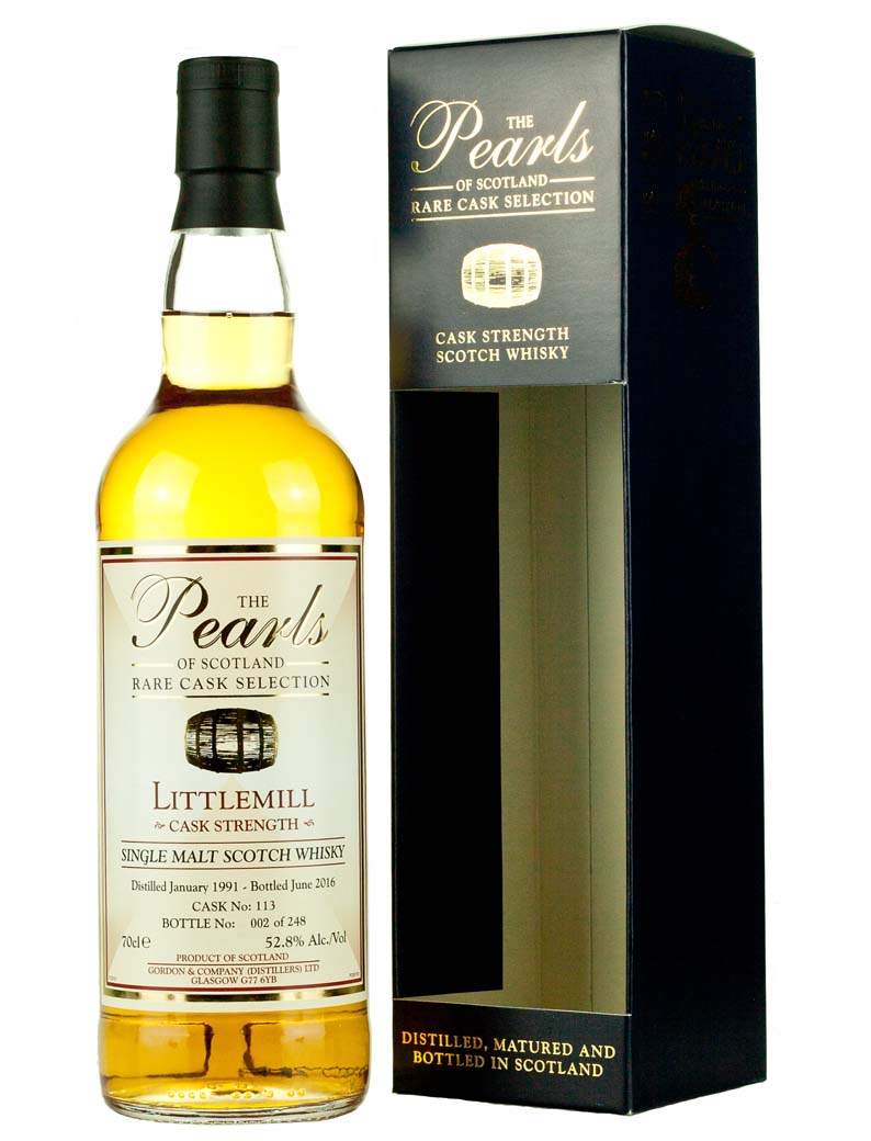 Littlemill 25 Year Old 1991 vintage Lowland single malt Scotch whisky. Single cask #113 distilled January 1991 and bottled June 2016 by Gordon & Co. for The Pearls of Scotland range. 248 numbered bottles.