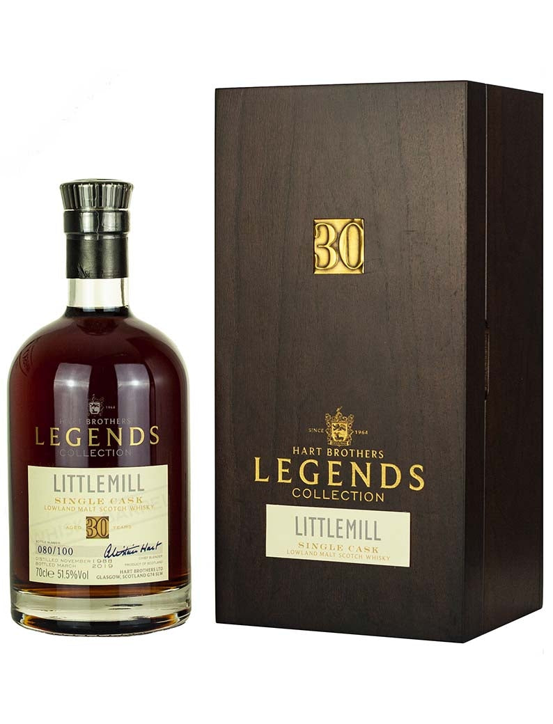 Littlemill 30 Year Old 1988 vintage Lowland single malt Scotch whisky. Single cask sherry butt bottled March 2019 Hart Brothers for the Legends Collection series. 100 numbered bottles.
