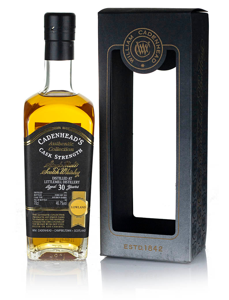 Littlemill 30 Year Old 1991 vintage Lowland single malt Scotch whisky. Single bourbon barrel bottled February 2021 by Cadenhead's for The Tasting Tour Of Scotland commemorating the retirement of Alan Murray former owner of Cadenhead's Edinburgh whisky shop. 102 bottles.