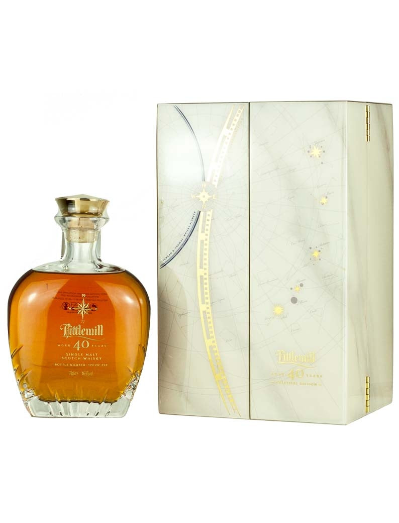 Littlemill 40 Year Old Celestial Edition Lowland single malt Scotch whisky. Matured in American Oak & First Fill Bourbon Barrels, double matured in Oloroso sherry casks and bottled 2018. Limited release of just 250 bottles. Each hand-crafted Glencairn Crystal decanter is engraved with its unique bottle number.