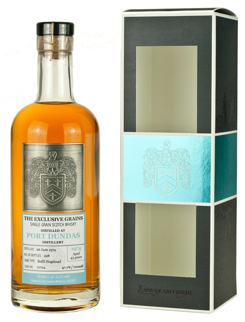 Rediscover the silenced art of grain whisky with Port Dundas 43 Year Old – 1974 Vintage, Exclusive Grains. Distilled at Glasgow’s fabled Port Dundas (closed 2009) and laid to rest in a single refill bourbon hogshead #71704, this whisky spent more than four decades mellowing into silk before Creative Whisky Co. bottled it in 2018 for their boutique Exclusive Grains series. Presented at natural cask strength, un-chill-filtered and natural in colour, only 228 individually numbered bottles showcase a Lowland grain of rare age: satin-smooth vanilla sweetness interlaced with polished oak, tropical fruit and gentle baking spice.
