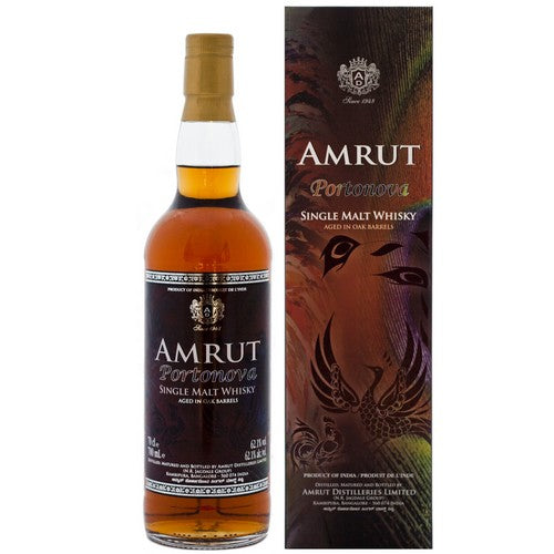 Amrut Portonova Indian single malt whisky. Unpeated Amrut single malt matured in fresh American oak and ex-Bourbon barrels followed by 12-month secondary maturation in Port pipes before a third spell maturing in ex-Bourbon casks. If you can get your head around that one.