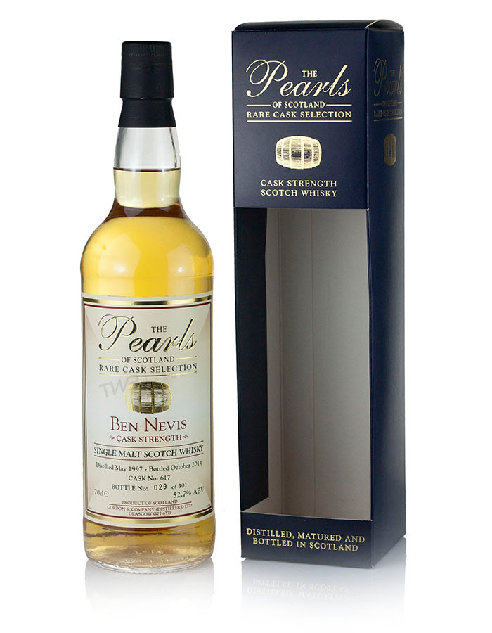 Ben Nevis 17 Year Old 1997 Pearls of Scotland is a rare Highland single malt Scotch whisky from single cask #617. Distilled in May 1997 and bottled in October 2014 by Gordon & Co. for the Pearls of Scotland series, this limited edition captures the robust, full-bodied character of Ben Nevis with rich fruit, oak, and spice. Only 301 bottles were produced.