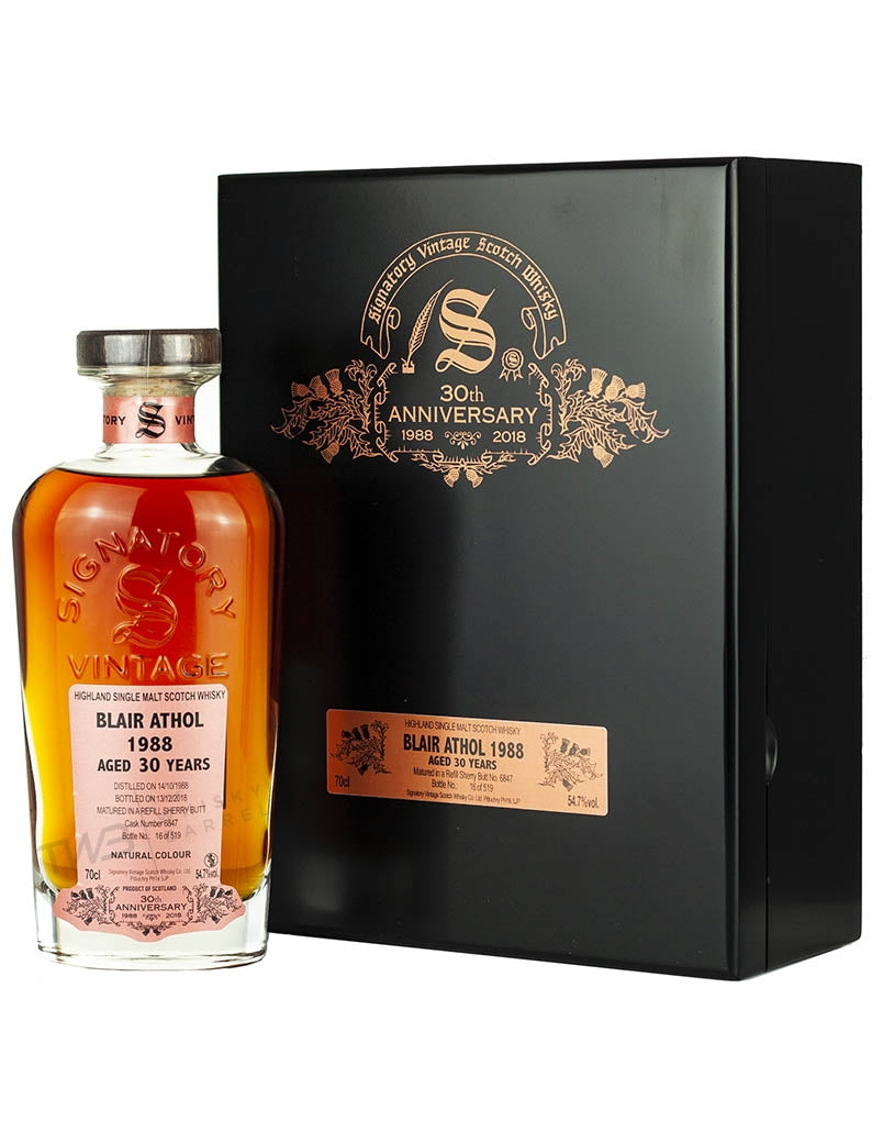 Blair Athol 30 Year Old 1988 vintage Highland single malt Scotch whisky. Single cask refill sherry butt #6847 bottled December 2018 for the Signatory Vintage 30th Anniversary series. 519 bottles.