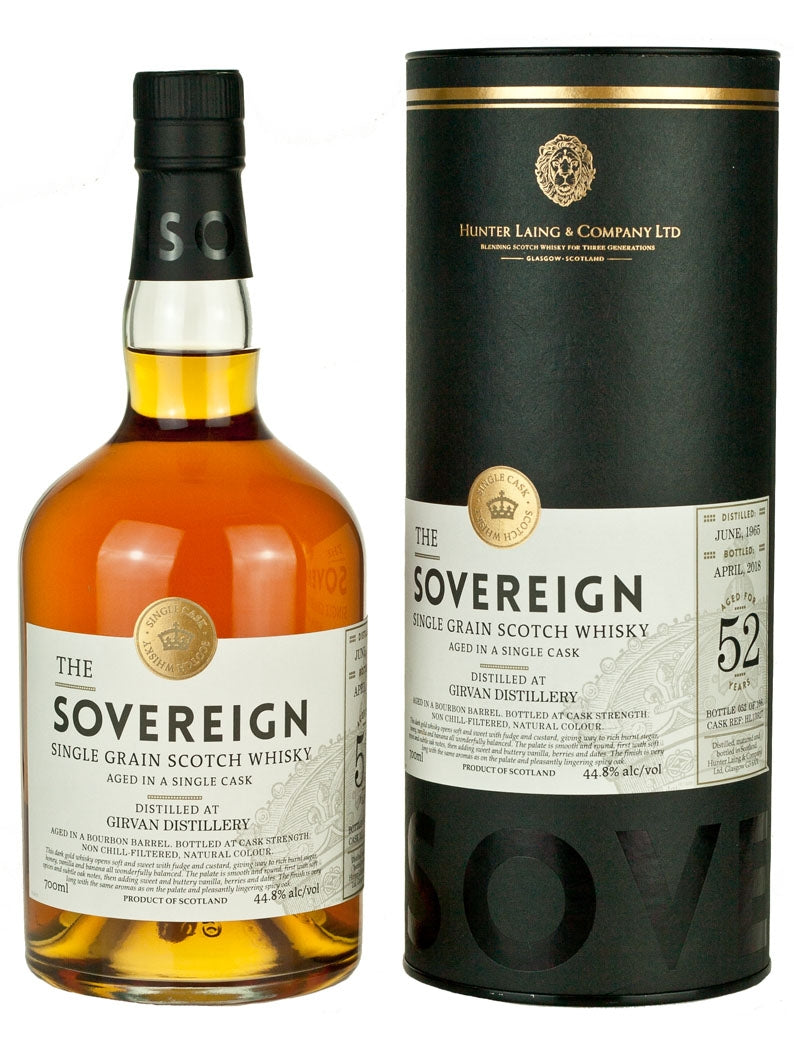 Girvan 52 Year Old 1965 vintage Lowland single grain Scotch whisky. Single cask bourbon barrel #13927 bottled April 2018 by Hunter Laing & Co. for the Sovereign series. 166 bottles.