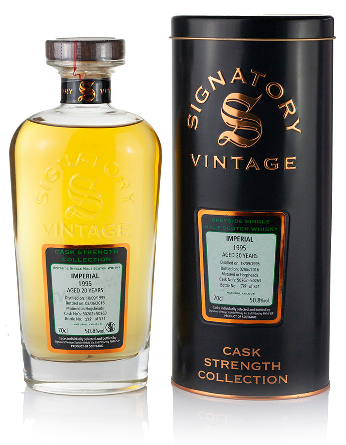 The Imperial 20 Year Old 1995 is a rare Speyside single malt Scotch whisky from the long-lost Imperial Distillery. Distilled in 1995 and matured in two refill hogsheads (#50262 & #50263), it was bottled in June 2016 by Signatory Vintage for their highly regarded Cask Strength Collection. With only 521 individually numbered bottles released, this limited edition captures the distillery’s elegant, fruit-forward style at full natural strength—a true collector’s treasure from a demolished Speyside landmark.
