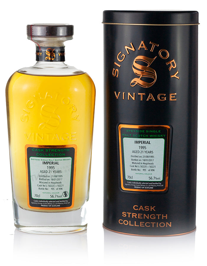 The Imperial 21 Year Old 1995 is a rare Speyside single malt Scotch whisky from the long-lost Imperial Distillery. Distilled in 1995 and matured in two refill hogsheads (#50220 & #50221), it was bottled in January 2017 by Signatory Vintage for their prestigious Cask Strength Collection. With only 496 individually numbered bottles, this limited release offers an exceptional opportunity to experience Imperial’s refined, fruit-driven style at full natural strength.