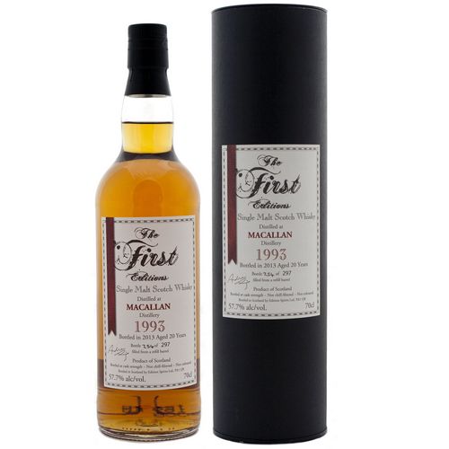 Macallan 20 Year Old 1993 vintage Speyside single malt Scotch whisky. Single cask refill barrel bottled 2013 by Edition Spirits for The First Edition series. 297 numbered bottles.
