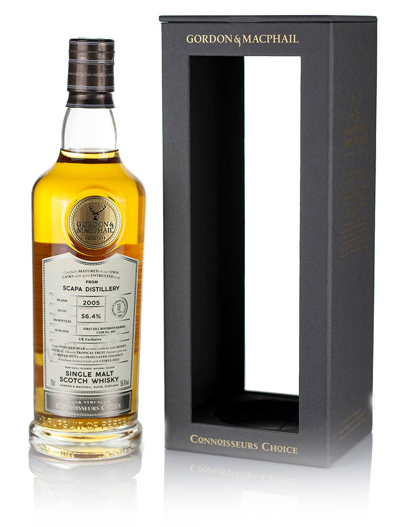 Scapa 17 Year Old 2005 vintage Orcadian single malt Scotch whisky. Single First Fill Bourbon Barrel #483 bottled August 2022 for the United Kingdom market by Gordon & MacPhail for the Connoisseurs Choice series. 186 bottles.