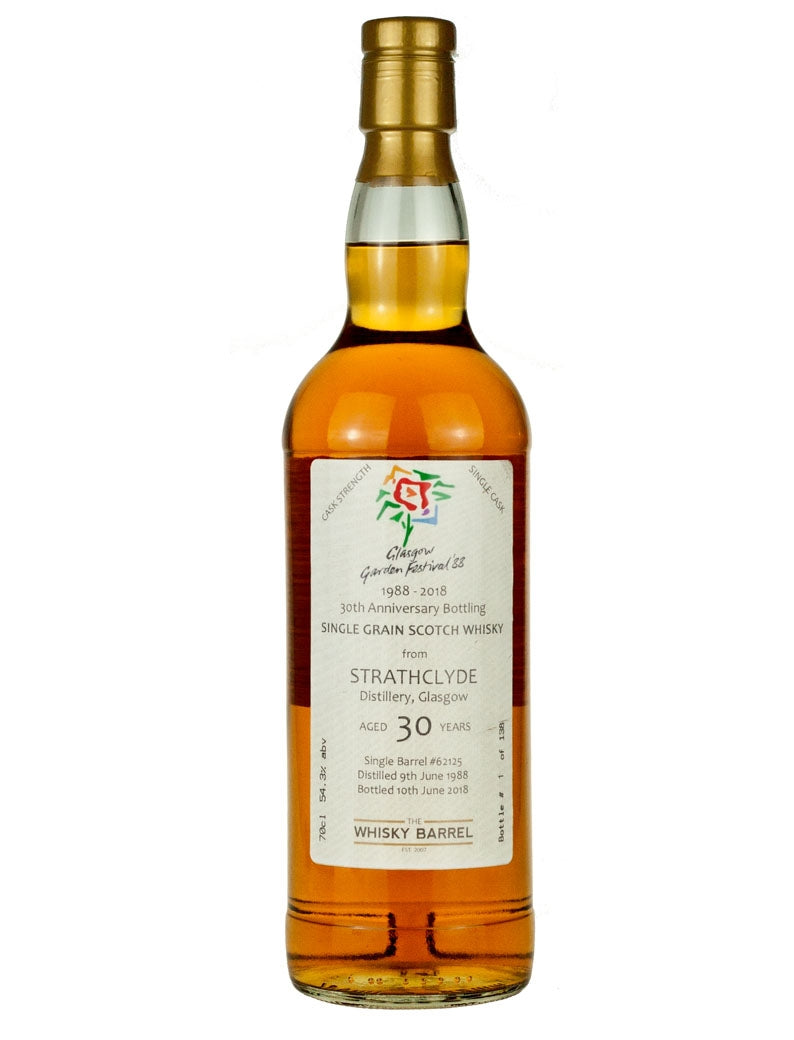Strathclyde 30 Year Old 1988 vintage Lowland single grain Scotch whisky. Single barrel #62125 distilled 9th June 1988, bottled 10th June 2018. Commemorating the 30th Anniversary of the Glasgow Garden Festival held on the banks of the river Clyde in the Summer of 1988. 138 numbered bottles exclusive to The Whisky Barrel. MAXIMUM 2 BOTTLES PER CUSTOMER.