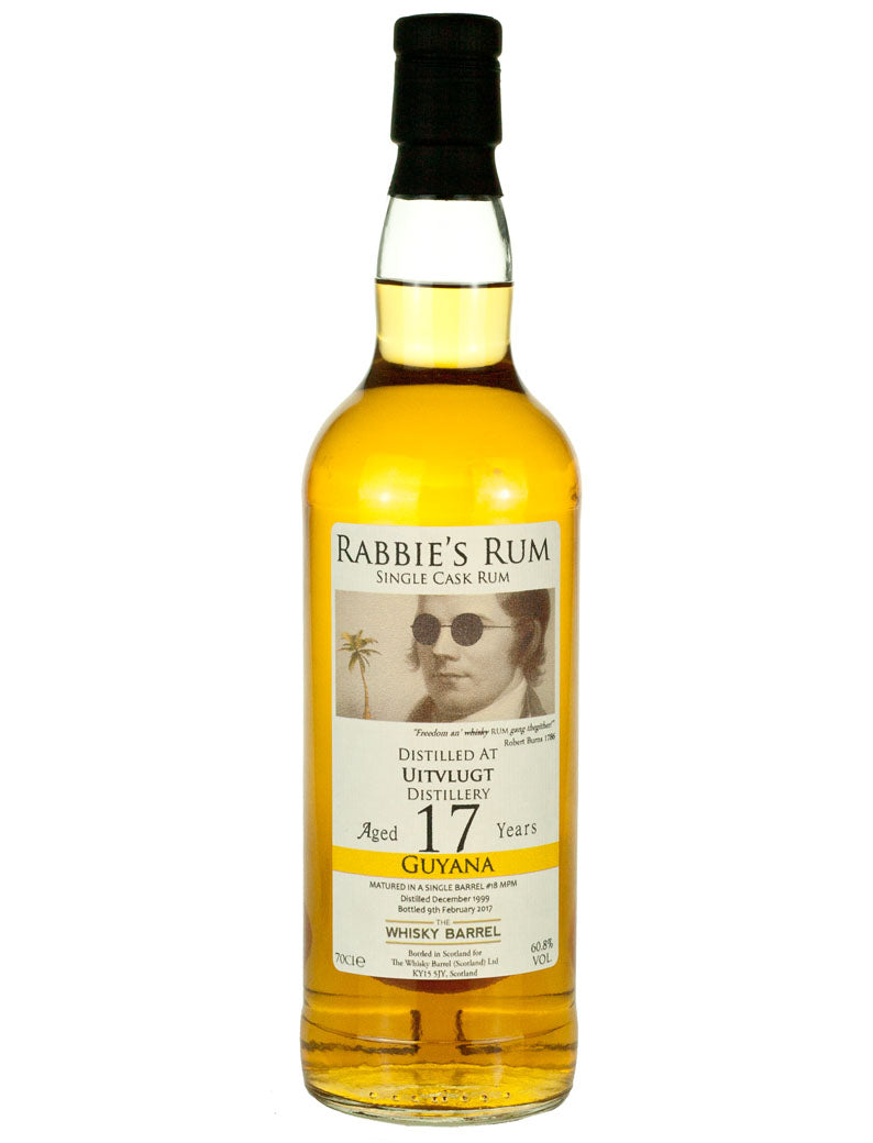 Uitvlugt 17 Year Old 1999 vintage single cask Guyanese Golden Rum from the Caribbean. Single barrel #MPM-18 distilled in a wooden Port Mourant still December 1999 bottled February 2017 for our exclusive Rabbie's Rums series.