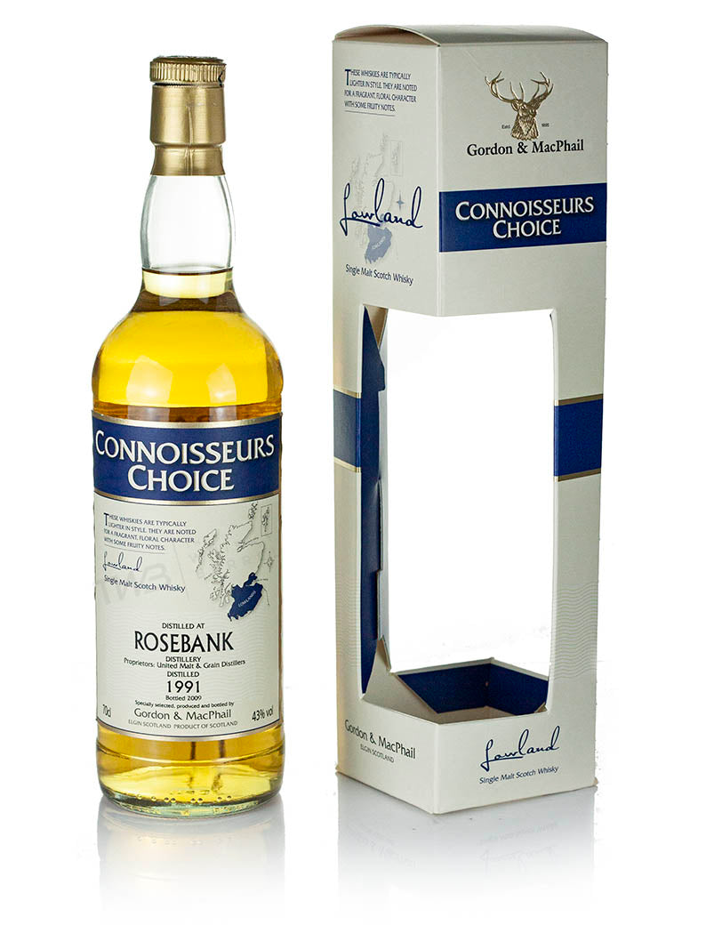 Rosebank 17 Year Old 1991 vintage Lowland single malt Scotch whisky. Matured in refill sherry and American oak casks, bottled March 2009 by Gordon & MacPhail for the Connoisseurs Choice series.