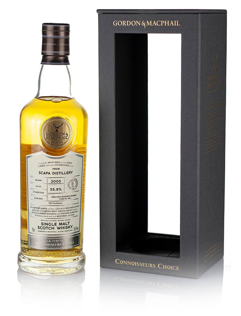 Scapa 17 Year Old 2005 vintage Orcadian single malt Scotch whisky. Single First Fill Bourbon Barrel #484 bottled August 2022 for the United Kingdom market by Gordon & MacPhail for the Connoisseurs Choice series. 173 bottles.